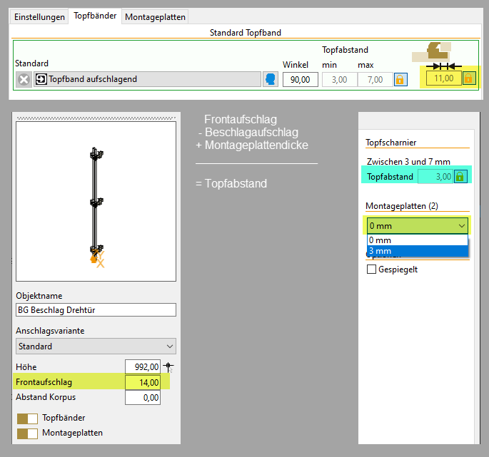 Die Beschlagsgruppe berechnet automatisch den Abstand zur Front und die dicke der Montageplatte anhand den übergebenen Kennzahlen!